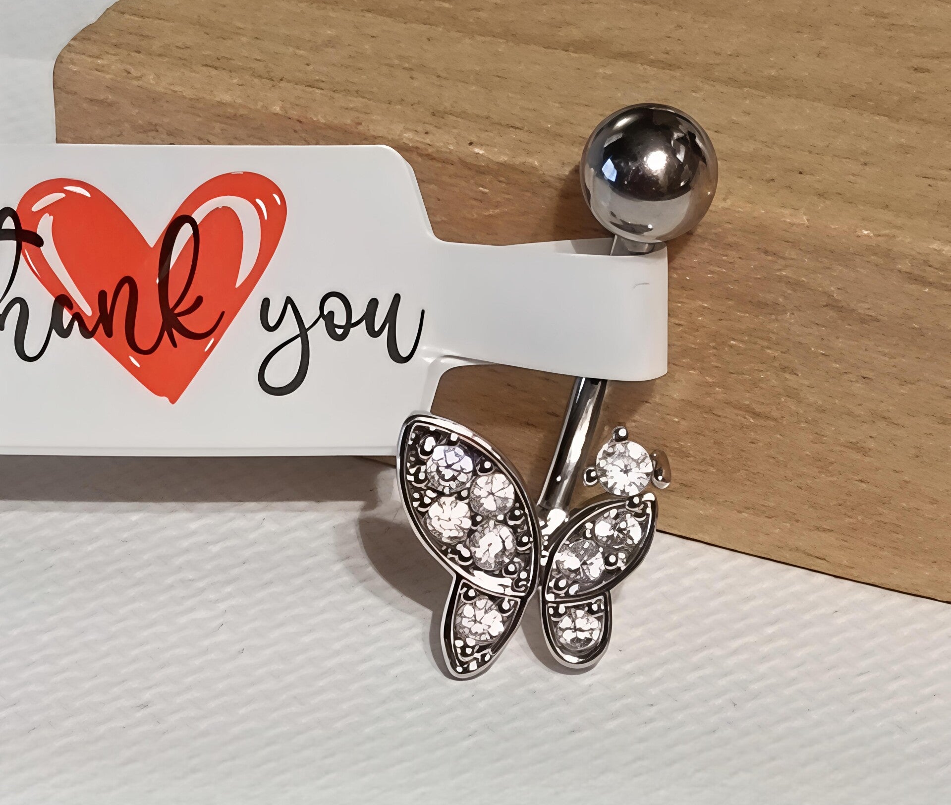 De piercing heeft een gebogen vorm (bananvormig) met een decoratieve vlinder die vast aan de onderkant is bevestigd en een afschroefbare kogel aan de bovenkant.